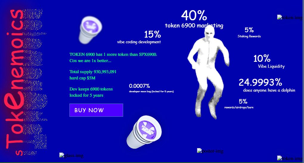 TOKEN6900 ($T6900) 是一款 ERC-20 代币,其动力源于“Nothing But Vibes”(无所不能)、“Delusion”(妄想)以及“Terminally-Online”(终末网络)交易者的集体幻觉。它受到 2000 年代怀旧情绪和 1969 年活力的启发,尽管其硬上限为 500 万美元,且预售量高达代币总供应量的 80%(744,794,473),但它却宣称自己毫无实用价值。TOKEN6900 创建在以太坊区块链之上,该区块链平台提供了强大而安全的保障,是纯粹由集体迷因驱动的妄想结晶,从而打造出新的反标普 500 市场之巅。