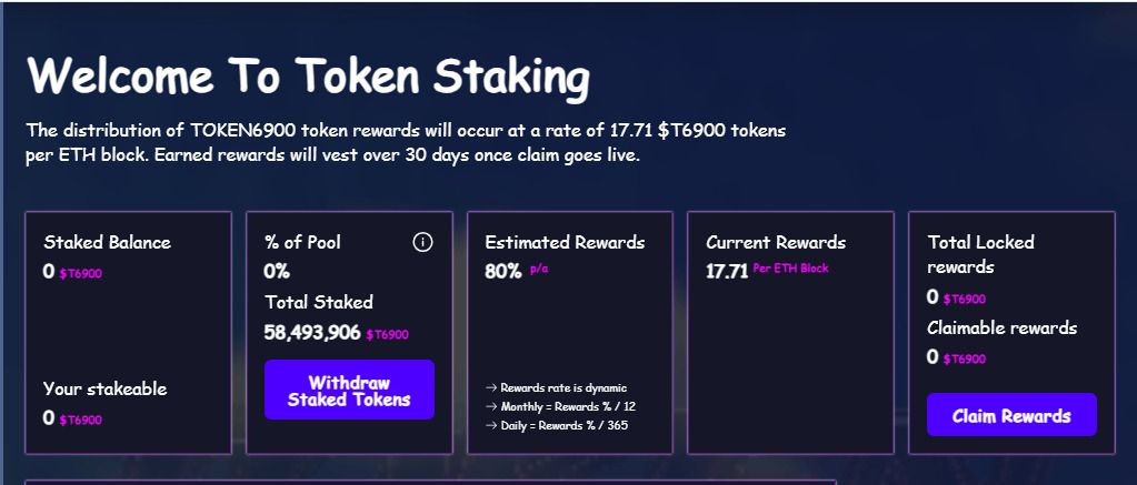 丰厚的质押奖励是 TOKEN6900 项目的一大亮点。TOKEN6900 通过被动奖励鼓励用户长期持有代币。这通过质押系统实现。质押是 TOKEN6900 生态系统的重要组成部分,它使平台的利益与社区的利益保持一致。