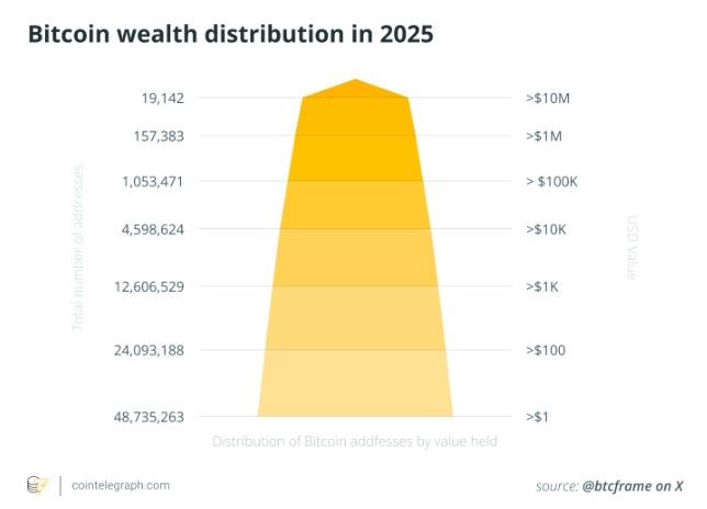 截至 2025 年,约有 90 万个地址持有至少 1 个 BTC,而全球约有 4% 的人口拥有一定数量的比特币。然而,大部分比特币却被少数富有的个人和机构控制。