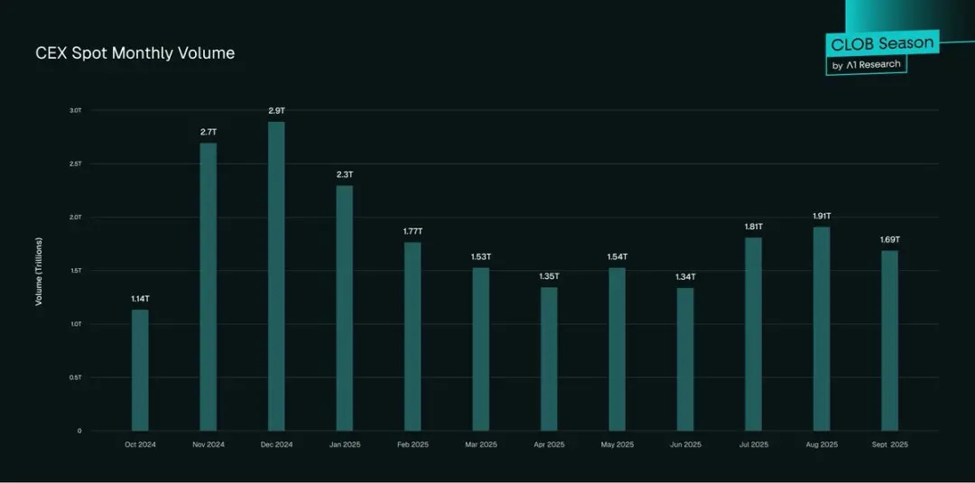 - CEX 表现:2025 年第三季度,CEX 现货交易量估计超 5.4 万亿美元,仍保持主导地位,较 2025 年第二季度增长 25%。