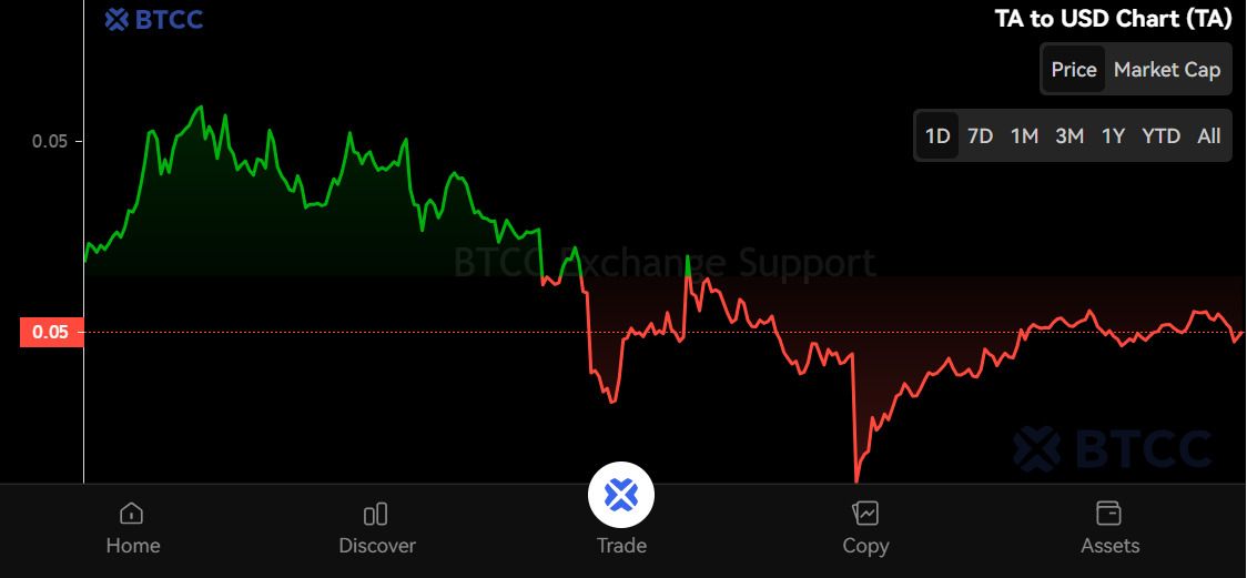 截至撰写本文时,TA 的交易价格为0.1014 美元,市值为1820 万美元,24 小时交易量为4120 万美元。TA 代币 24 小时变化为-8.0% ,过去一小时内小幅波动为-1.8% 。
