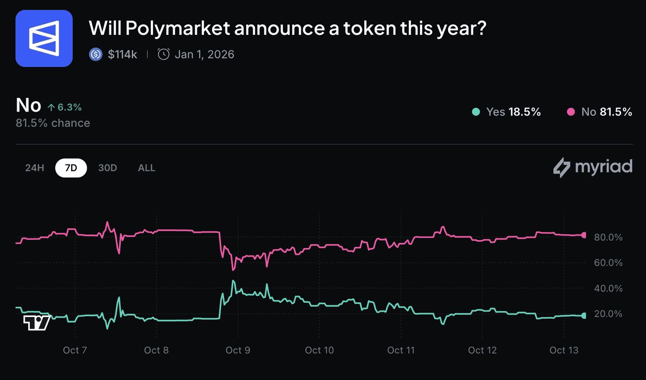 加密社群已经在猜测Polymarket 何时会正式宣布其代币。在竞争对手去中心化预测平台Myriad 上,一个名为「Polymarket 会在今年宣布代币吗?」的热门市场已吸引超过114,000 美元的押注。截至2025 年10 月,赔率如下:
