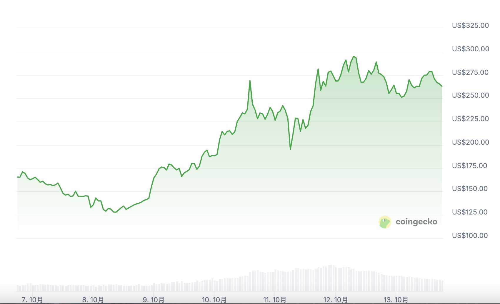 作为近期表现优异的明星项目,$ZEC 毫无疑问是行业内的龙头标的,昨日达到近几年内最高点 293 美元,7 日涨幅 295%,市值 42.6 亿美元。