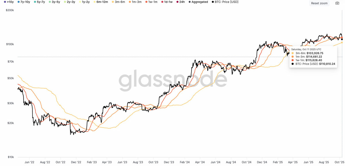 Glassnode进一步数据显示,持有周期为一周至一个月的投资者成本价已重新高于一个月至三个月持有者。这表明需求和净资金流入动能增强,交易者在下跌时积极买入。