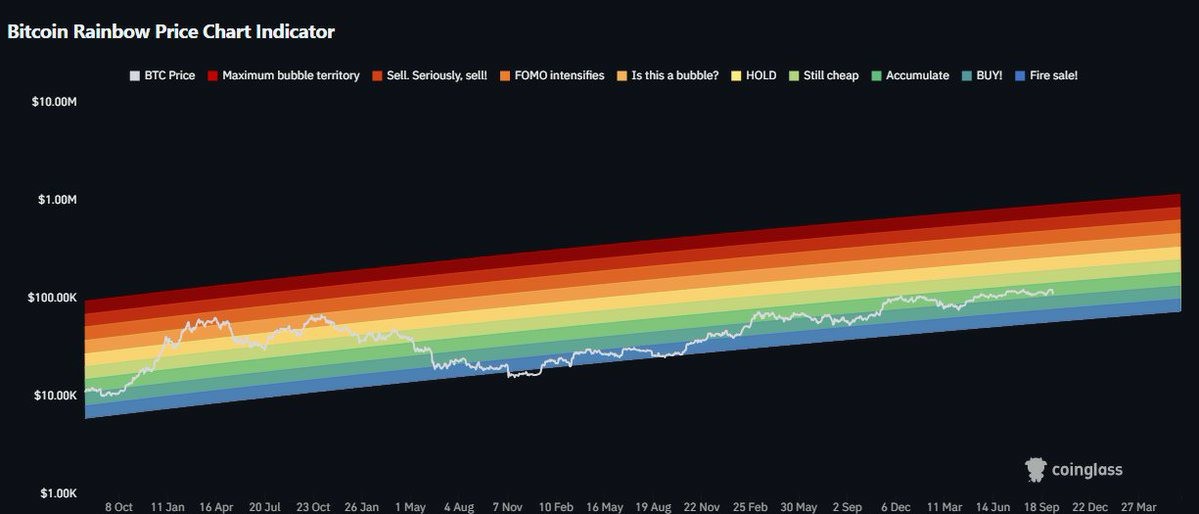 结合比特币彩虹价格图(Rainbow Chart),这位分析师指出,“浅绿色/黄色区间(14万-20万)”或许是价格达到这些水平后开始逐步减仓的理想节点。