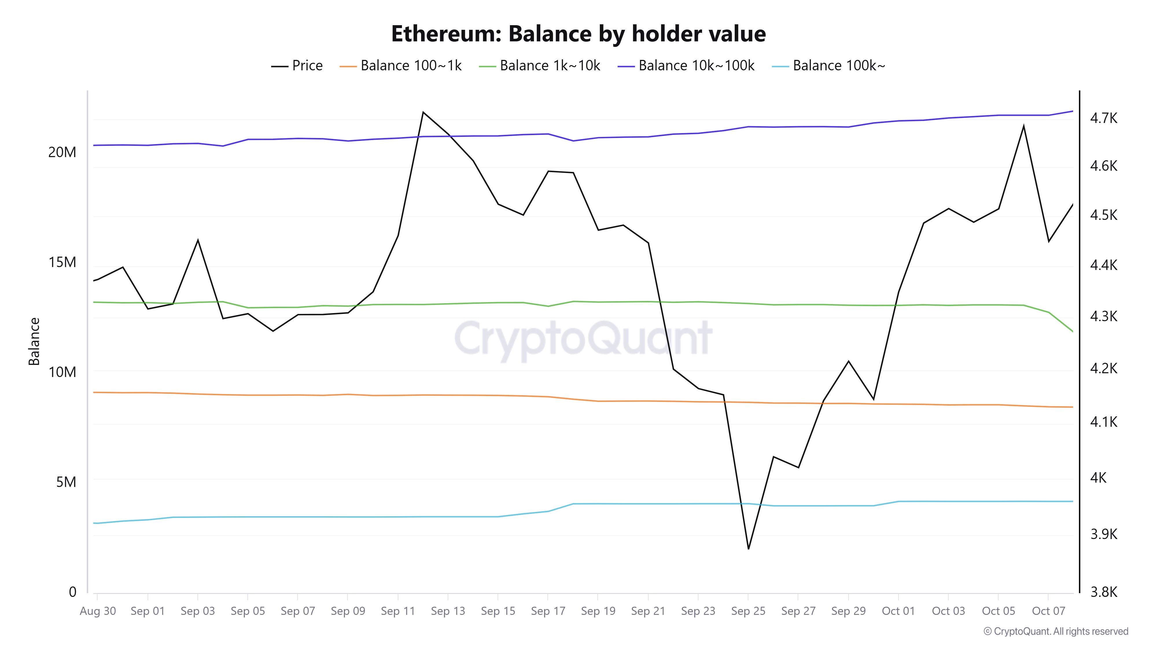 此次下跌导致中型持有者(持有1K-10K ETH的钱包)启动了大规模分发,自周一以来其集体余额减少了122万ETH,数据来自CryptoQuant。