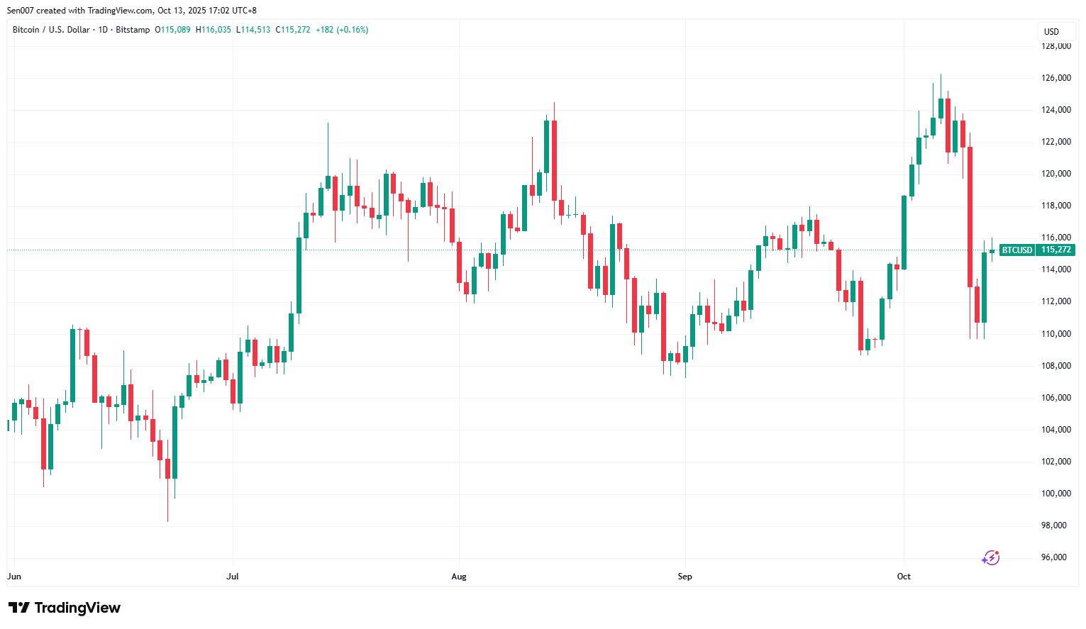 截至10月13日发稿,比特币反弹至11.5万美元之上,以太币反弹至4200美元。
