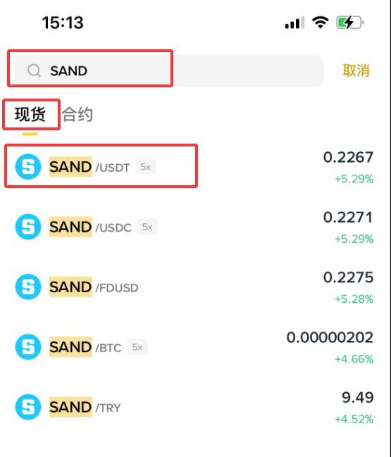 3、输入【SAND】,这时下拉会显示【现货】【SAND/ USDT】,点击【SAND/ USDT】。(作为新手,不建议做合约,所以这里就不演示合约购买方式了。)