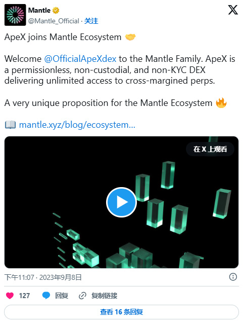 - ApeX 与Mantle 官方互动频繁,Bybit 也加入声援。
