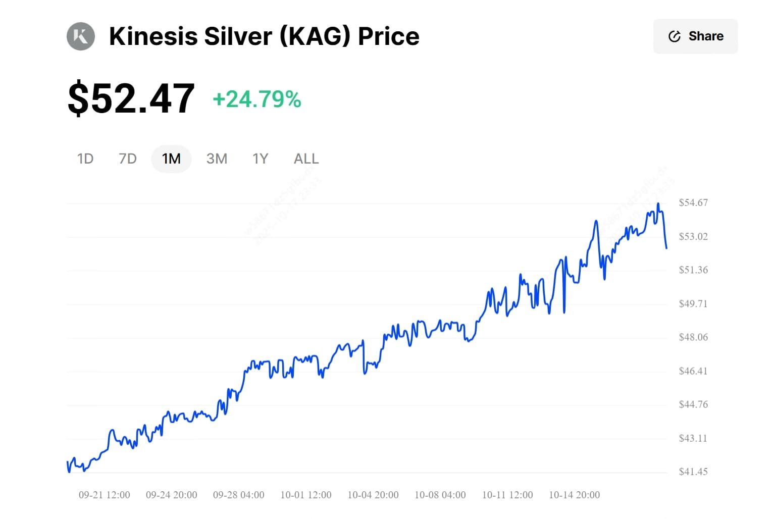 截至2025-10-17,随着实体白银达到每盎司53.84美元,市场兴趣不断加速。该行业的市值已超越2亿美元,交易主要集中在Kinesis Silver (KAG)、Silver Token (XAGX) 和Gram Silver (GRAMS),交易者寻求链上接触可赎回、实物支持的资产。