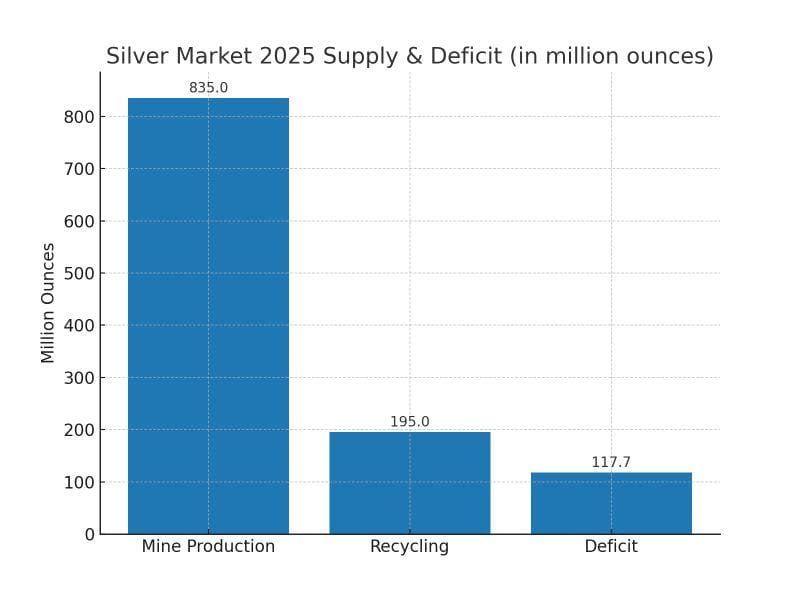 • 结构性赤字:《2025年世界白银调查》突出连续第五年年度短缺(约1.17亿盎司),2024年的赤字接近1.49亿盎司,因为太阳能和电动车需求创纪录。约8.35亿盎司的矿产产量落后于超过9亿的需求,而回收只能部分弥补差距。
