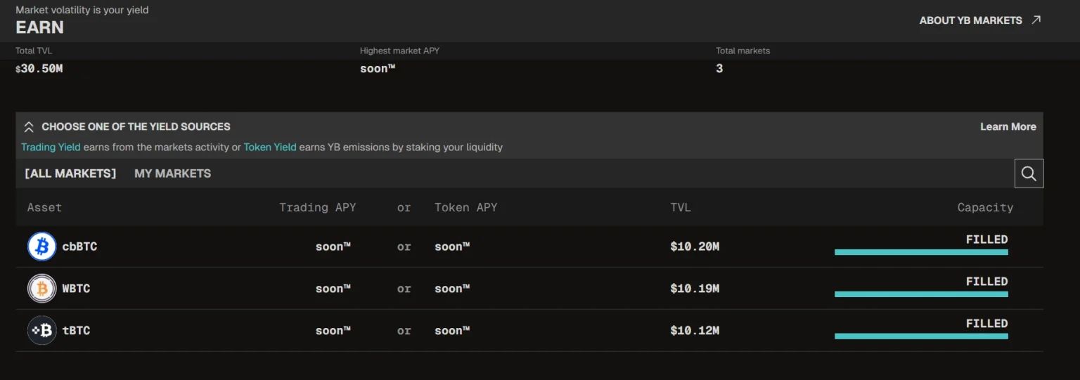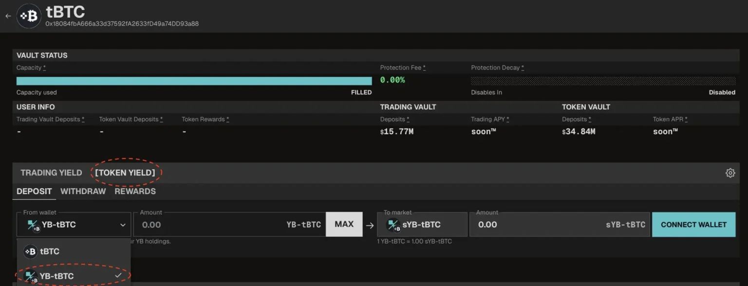 此外,随着 $YB 的推出,现有的流动性提供者(ybBTC 代币持有者)将拥有一个新的挖矿选项,允许他们选择协议的 $YB 代币发行作为奖励,而不是交易费。用户可以通过在“收益”部分选择“代币收益”来获得 $YB 奖励。代币发行金额将根据选择 $YB 奖励的流动性提供者 (LP) 总数的百分比动态确定。