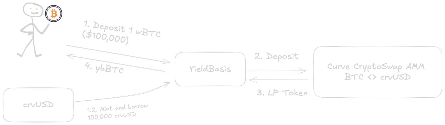 - 借贷和配对:BTC 与等值美元的 crvUSD 配对(通过专用 CDP 借入)。两种资产均存入 Curve BTC/crvUSD 池。