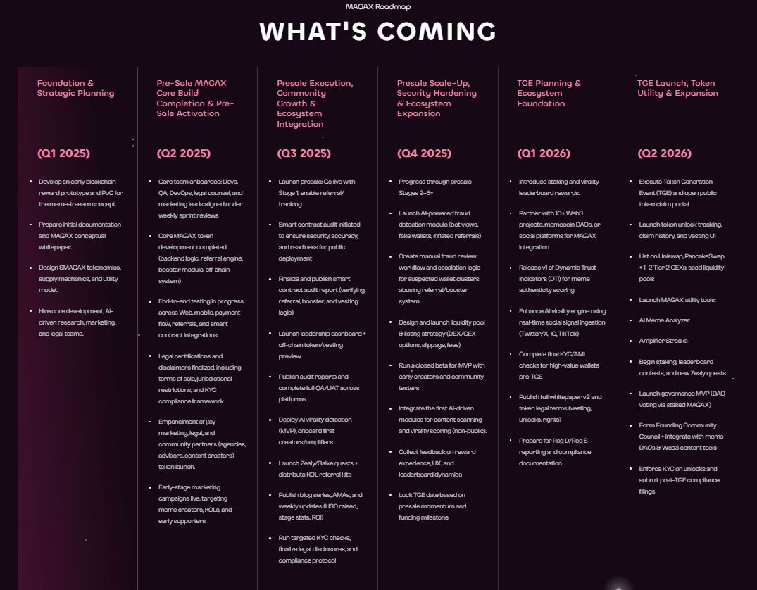 基础与战略规划(2025 年第一季度) | 预售 MAGAX 内核构建完成及预售激活(2025 年第二季度) | 预售执行、社区发展和生态系统集成(2025 年第三季度) | 预售规模扩大、安全强化和生态系统扩展(2025 年第四季度) | TGE 规划与生态系统基金会(2026 年第一季度) | TGE 启动、代币实用性和扩展(2026 年第二季度) |