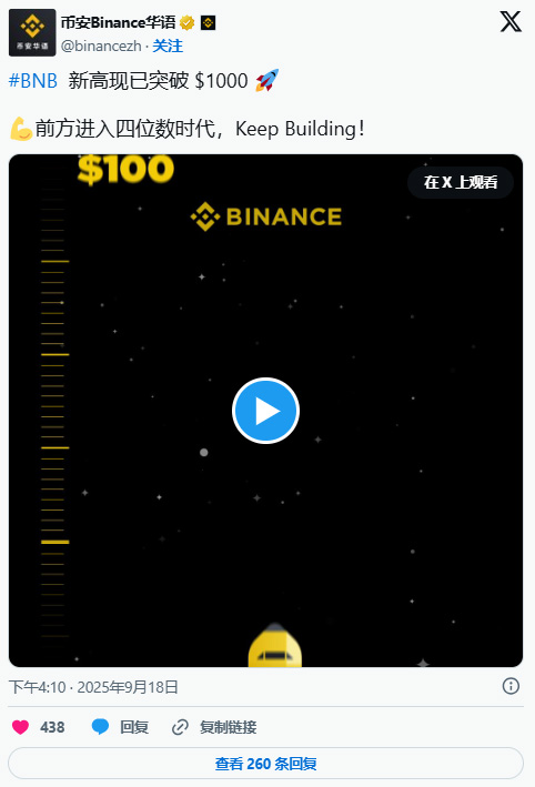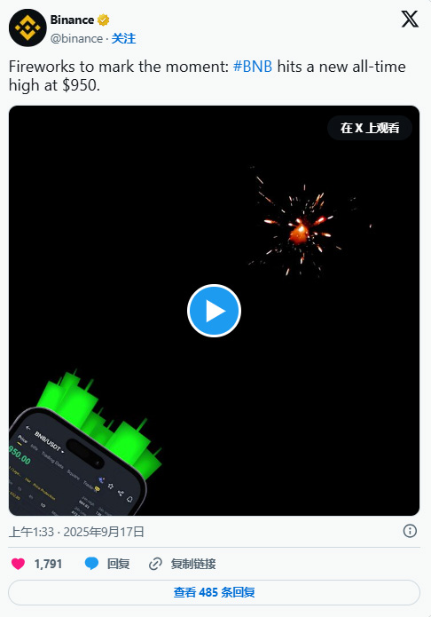 2025 年中突破1,083.47 美元创历史新高,9 月进一步上攻至1,349.99 美元。10 月11 日受国际消息影响,市场短线出现剧烈回调,BNB 一度跌至860.11 美元,随后迅速反弹并于1,200 美元附近高位震荡整理。