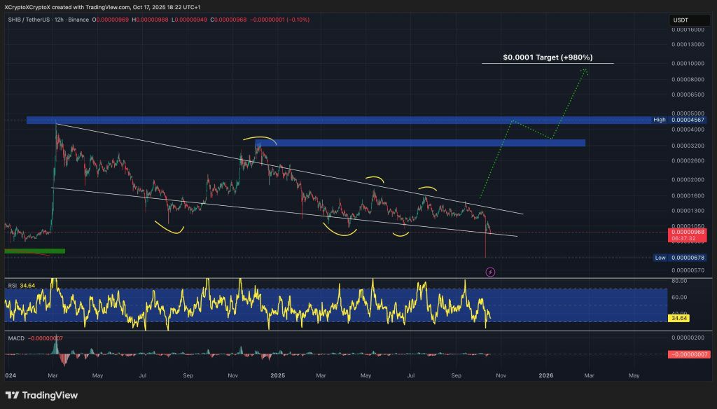 SHIB当前在长期下降楔形形态内震盪整理,这是一种典型的看涨反转信号。根据历史价格走势推算,该形态若被突破,可能引发剧烈上涨。