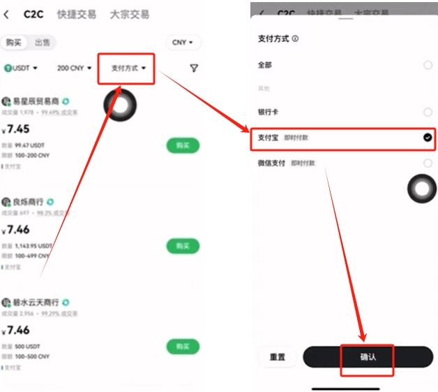 点击欧易首页的【买币】,这里有C2C买币和快捷买币,我们选择C2C买币。