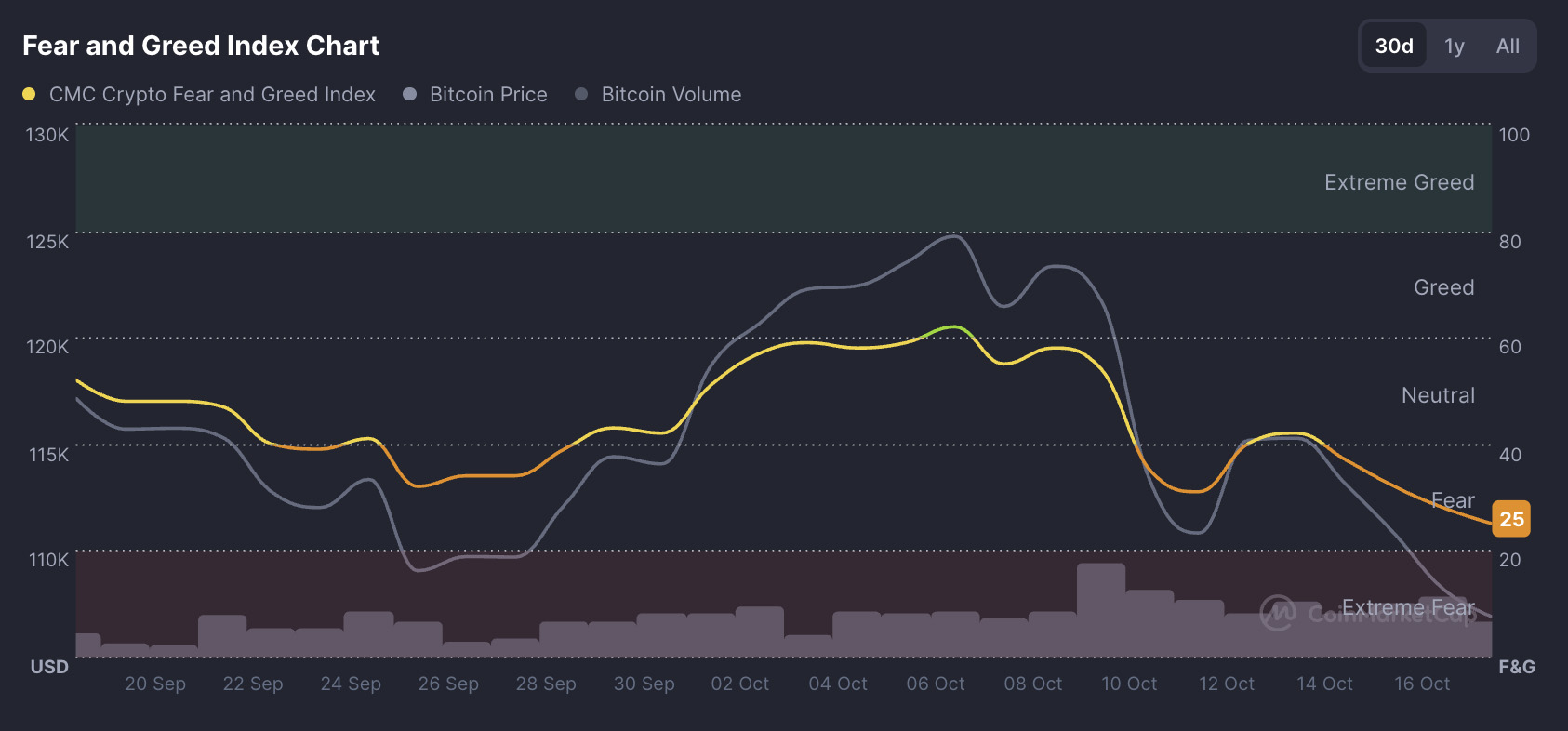 ●回调后恐慌情绪高涨:加密货币恐惧与贪婪指数大幅下跌,在 10 月 17 日左右触及今年最低水平。社交媒体叙事变得谨慎,交易员平仓,稳定币交易量上升——这通常是资本转向安全的迹象。