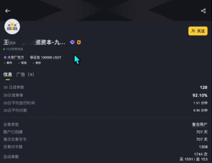 筛选的时候我们就需要点开每一个商家的主页,去看一下他账户已创建的时间以及首次交易至今的时间,还有他的成单数、成单率,看他的认证状态是不是都有了视频认证。看他冻结了多少保证金,是不是大宗的广告方,有多少种验证方式。这里面的钻石商家才是更加顶级的商家,我们去跟他交易就越能够放心。而且我们尽量去找这些24年以前注册的商家,一个一个去找。这样就能够在最大的程度上降低我们卖币时候被封卡的概率。当然我们刚刚说了在币安的严选区出现问题它是100%赔付的,所以币安这点还是值得信赖的。