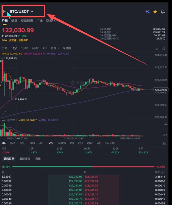 什么是限价单呢?我们可以看到左侧其实是一个买卖的盘口,红色的是卖单,绿色的是买单。如果我使用限价单就可以自己去设定价格,比如说现在比特币的价格是121970,我希望等这个价格跌到121000的时候我再买入,我就可以把这个价格输入进来,然后拉动我们的滑杆,我这里把他拉满,点击【买入BTC】。