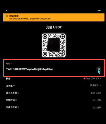 接下来就会出现一个充币的地址,我们把他复制一下,然后到欧易这里把它粘贴进去。