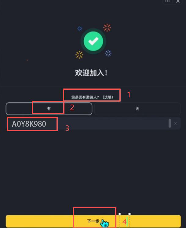 这个时候我们就注册成功了,他这里会问我们“您是否有邀请人?”,这里我们一定要选择“有”,然后邀请ID这里我们就可以填写A0Y8K980。使用这个邀请码进行注册,就可以让我们在后续的交易中永久享受20%的手续费优惠。点击【下一步】。
