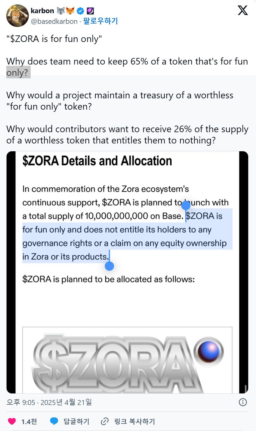 加密货币专家@basedkarbon 指出,“如果只是为了好玩,为什么团队能获得 65%?为什么贡献者不能获得 26%?如果这种货币毫无用处,为什么要创建金库?”