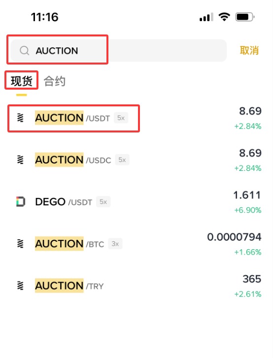3、输入【AUCTION】,这时下拉会显示【现货】【AUCTION/ USDT】,点击【AUCTION/ USDT】。(作为新手,不建议做合约,所以这里就不演示合约购买方式了。)