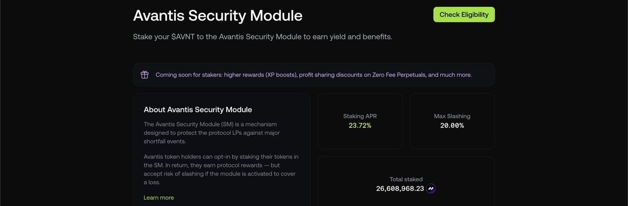 您可以将AVNT 代币质押到安全模组中,该模组就像Avantis 流动性提供者(LP) 的保险池。作为回报,您将: