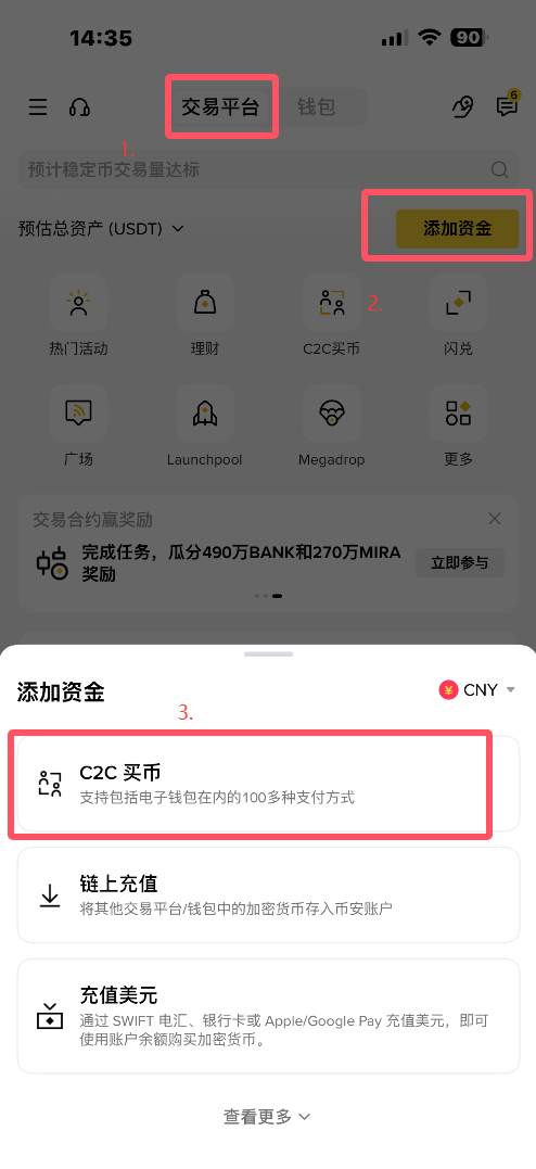 1.进入APP,在交易平台,点击添加资金,选择C2C买币,如图