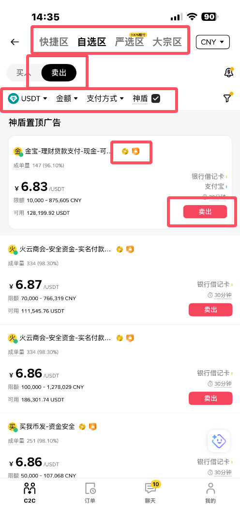 2.选择需要的区域,点击【卖出】,下面选择出售的币种,金额,支付方式,勾选神盾(这个一定要勾选,一定要选择认证广告方和神盾广告方,安全出金才是最重要的),点击卖出,如图