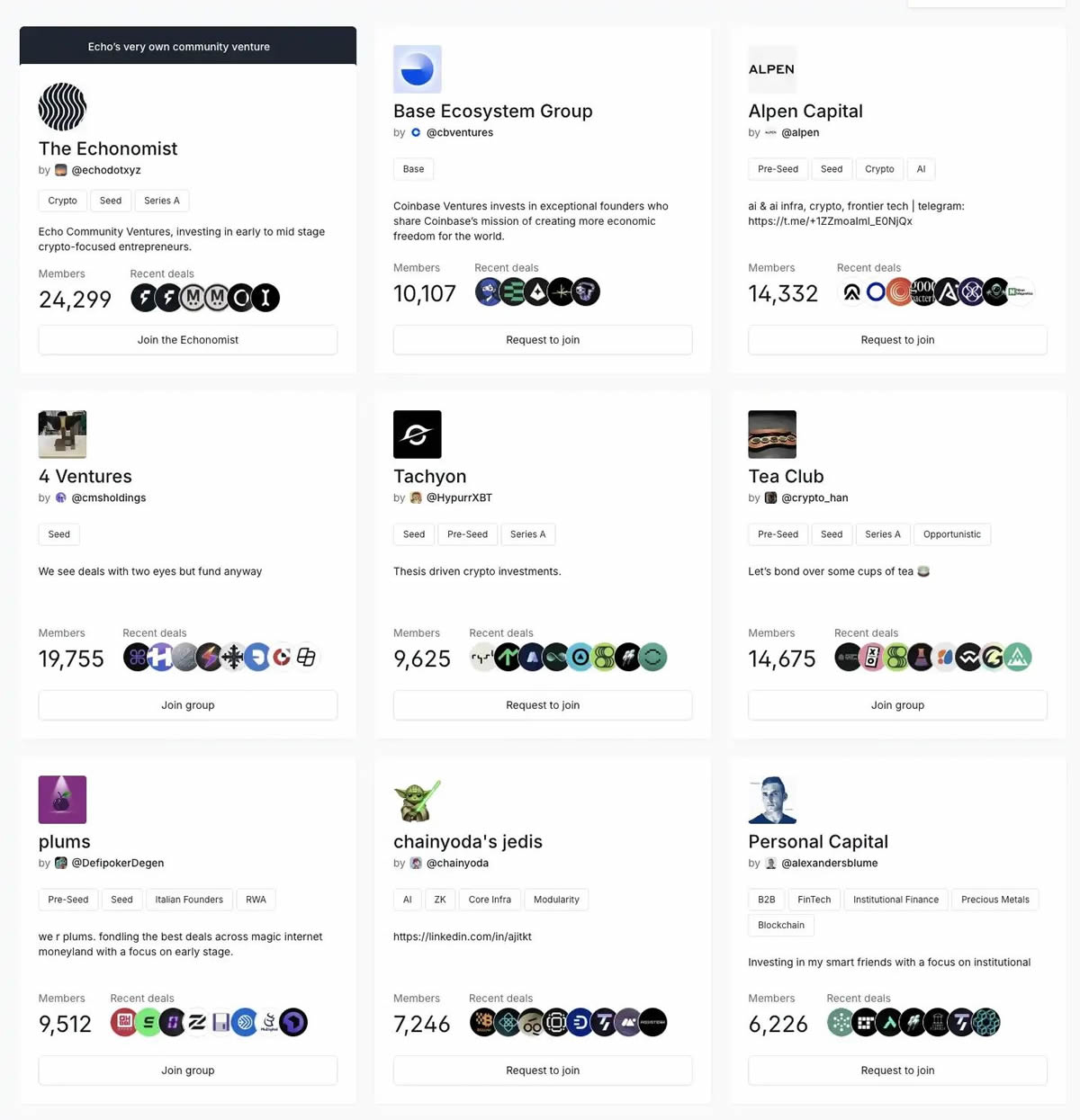 在群组页面,我们可以申请想加入的群组,在加入前我们都能看到群组的人数和最近成交的 Deals,部分群组是邀请制,只有受邀请的用户才能加入。