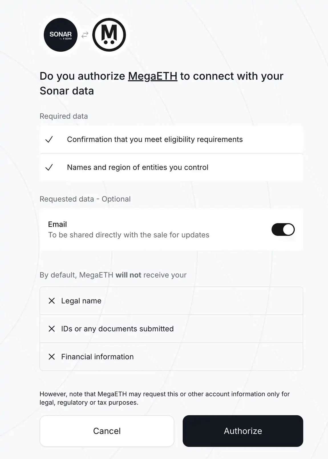Sonar 上目前最火的 ICO 是 MegaETH,10 月 15 日至 10 月 27 日期间处于注册时间,注册截止时间还有 6 天。完成 KYC 身份验证步骤比较多,但在资料完善且顺利的情况下几乎是秒通过的,如果需要等待的话则是在进行人工审核,需要等待至少 1-3 天,因此尽早完成 KYC。