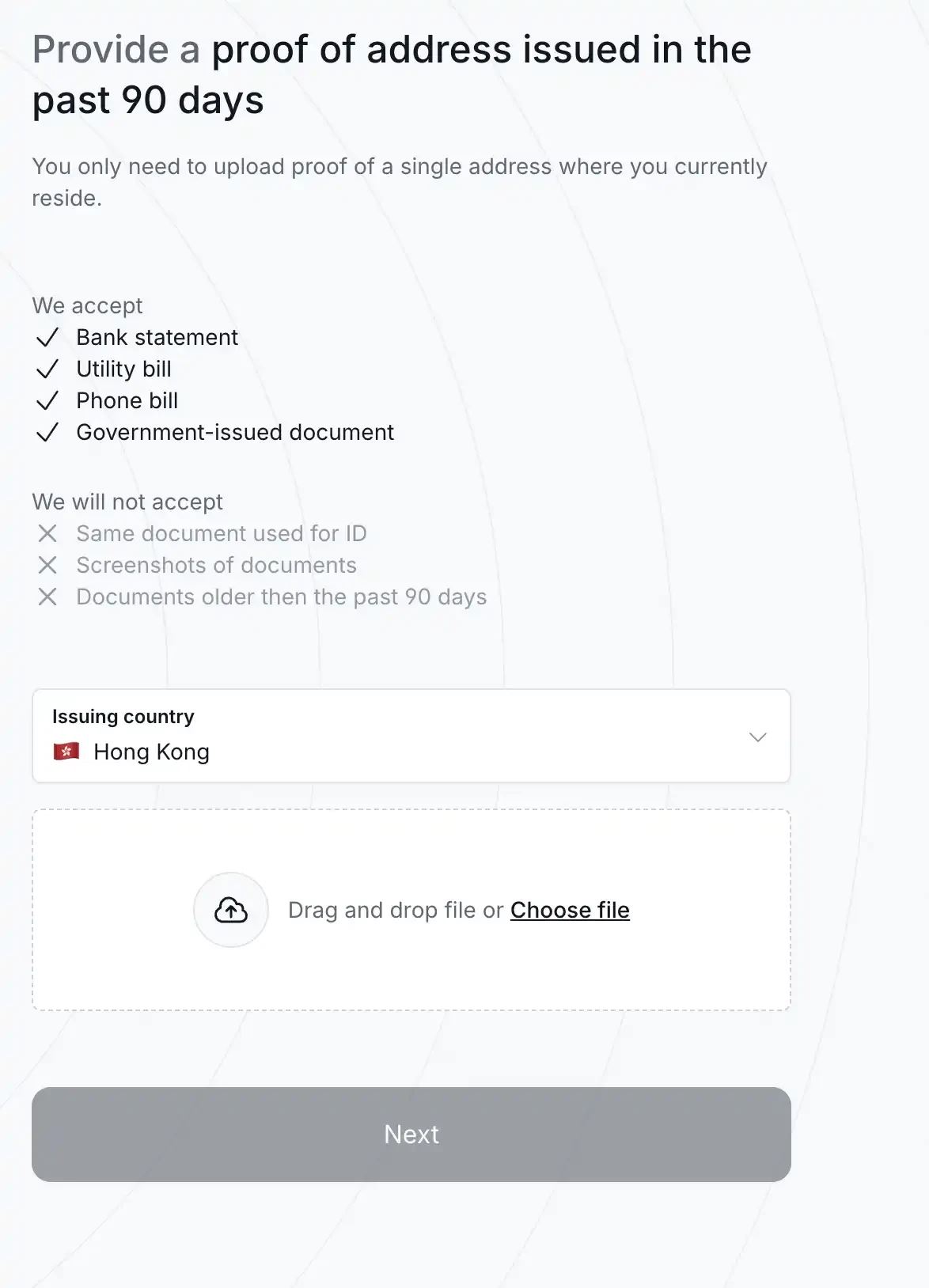 中国地址被列入了禁止参与的地区,因此需要提交其他地区的地址证明。推特上有很多博主都讲了解决地址证明的途径,这里就不多做介绍了,我们之后的步骤主要就是按照大陆护照和香港地址证明、银行账单的资料为例进行。