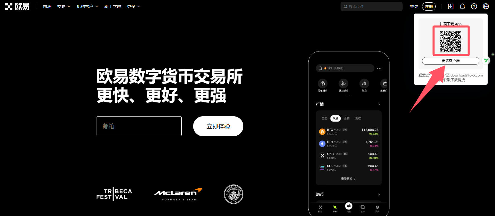 在你的电脑(Windows PC 或 Mac)上打开浏览器访问OKX官网,点击右上角下载按钮,点击【更多客户端】。