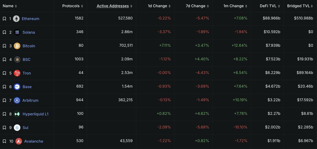 根据DeFillama统计,目前Hyperliquid 的DeFi 应用一共有22.7 亿美元的总锁仓量(TVL),已经进入前10 大公链之列。