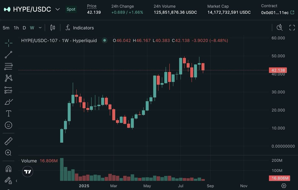2025 年7 月,伴随市场情绪好转,加上HyperEVM 推出、引进BTC 和ETH 现货交易等利好事件影响,HYPE 创下49.7 美元历史新高。