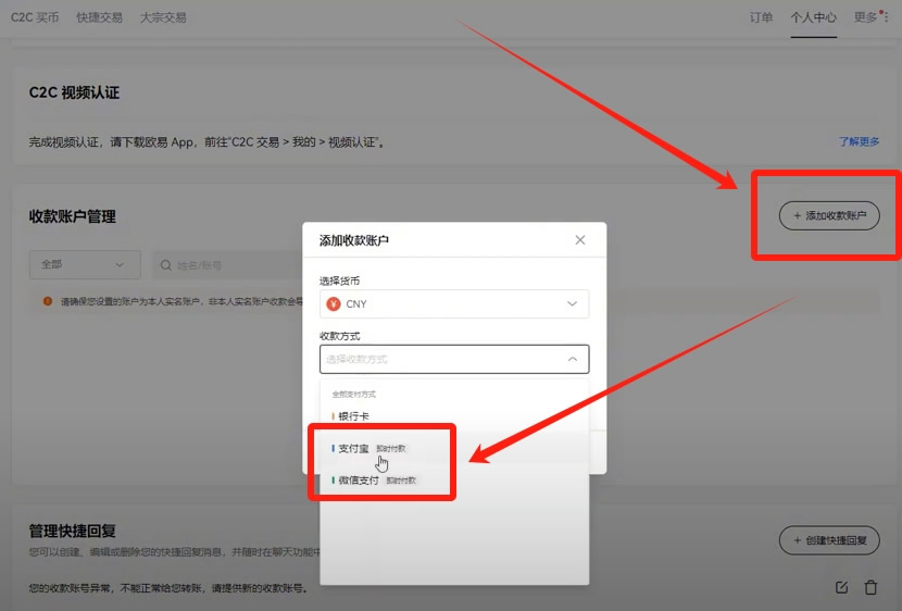 同样我们还可以点击收款方式添加支付宝和微信。需要注意的是,这里你添加支付宝、微信和银行卡都是要你本人实名的账户,就是你用身份认证实名的那个账户添加才可以。