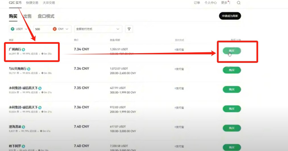 现在我们就来购买USDT。选择USDT之后,在后方输入你想筛选的金额。比如说我这里输入500人民币。后方你还可以筛选支付方式,这里我们就先不筛选了。他下方就会给你筛选出来一些商家,大家可以看到7.34、7.35、7.36,上面的比例基本上都是支付宝。现在也形成了一个潜规则,就是金额较小的入金,大多都是支付宝和微信,金额稍微大一点的才有银行卡的商家来接单。