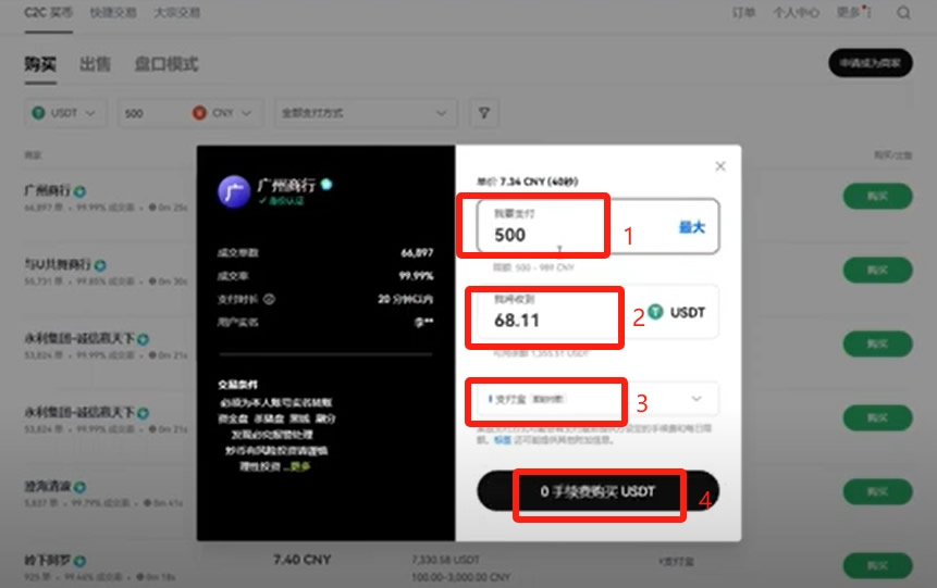 以C2C为例,选择您要购买的币种(如USDT)、金额和支付方式,在卖家列表中选择一个信誉好、成交率高的卖家,点击“购买USDT”,按照提示完成付款并在平台上点击“已付款”。等待卖家放币即可。
