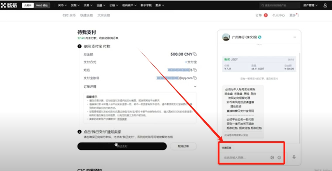 接下来这里就会生成一个订单。有金额、支付方式、有对方的姓名和支付宝账号。你可以把这个支付宝账号复制下来,在手机上通过支付宝给他进行转账。我们一定要看右边的聊天框,像支付宝微信会比较简单,你用自己实名的支付宝、微信给他转钱就可以了。支付宝你就直接进行转账。微信的话有些人会要求你不能发红包,因为你发红包他还要领取,你要选择转账。