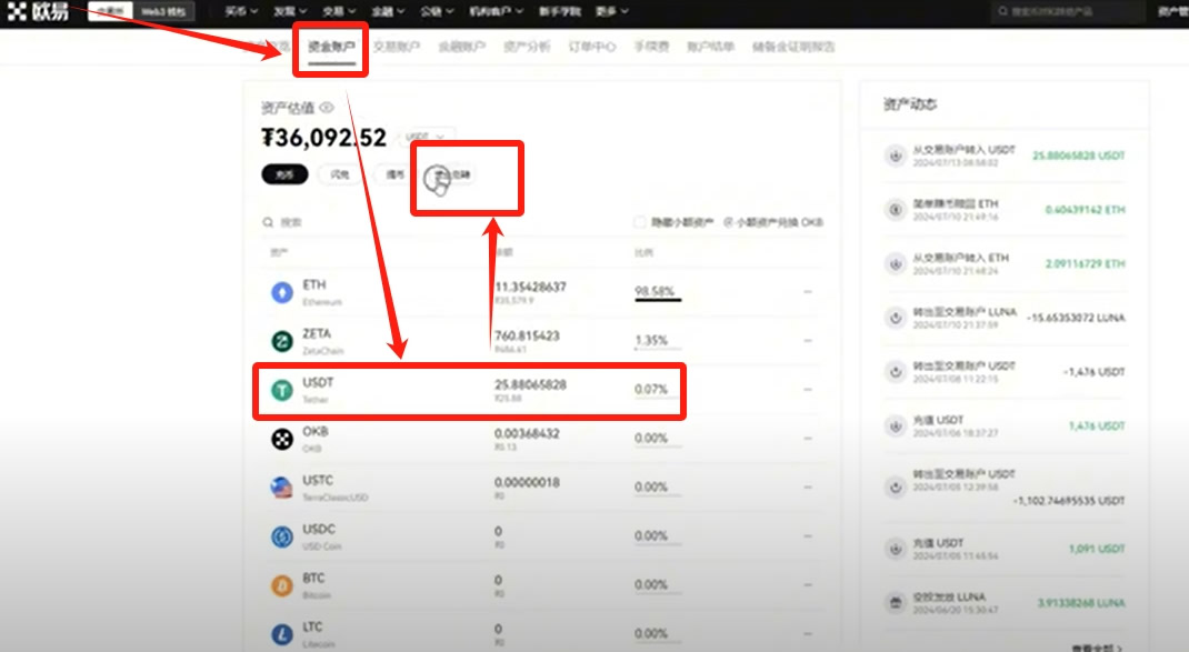 上方选择“交易账户”,可以看到我们刚才购买的比特币就在这里。右方也有我们的资产动态、交易的时间,25.799个USDT进行购买。剩下的USDT就还在下方这里,太少了没法买,这也是一个很常见的情况,大家不用过于担心。