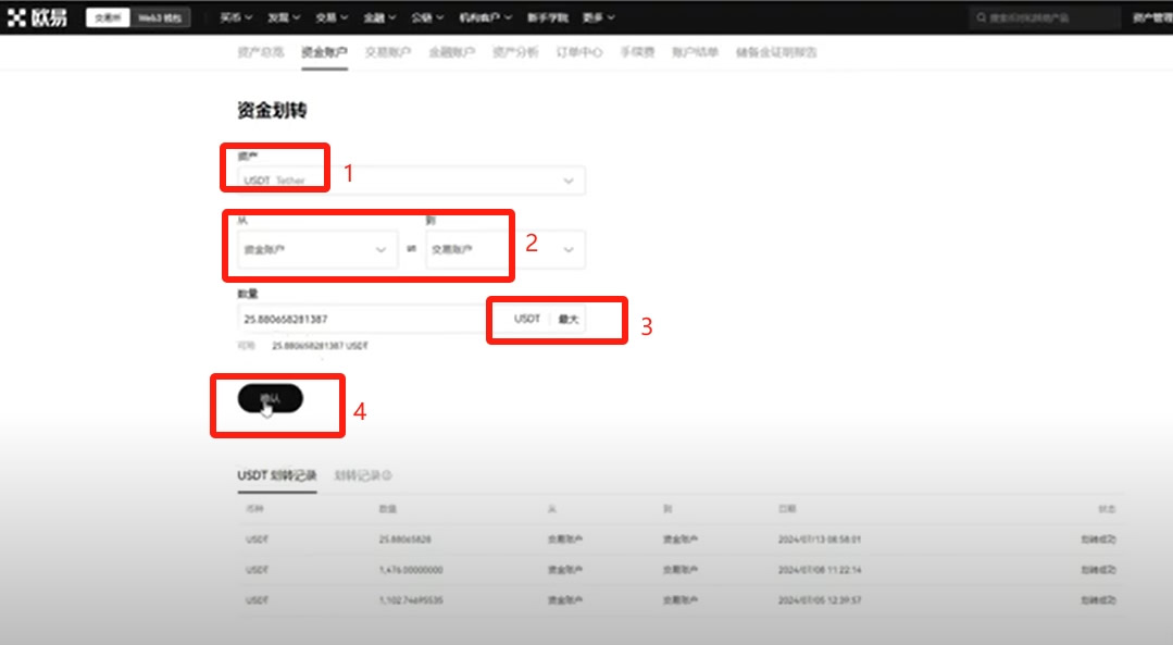 他这些是给你分三个账户也是非常实用,是更加方便的,因为分的更清楚了,使用更加方便。刚买到的USDT是会在资金账户里面的,大家可以看到我们资金账户里现在有25个USDT。我们需要把它划转到交易账户才可以进行购买比特币,或者别的加密货币,点击这里的【资金划转】。
