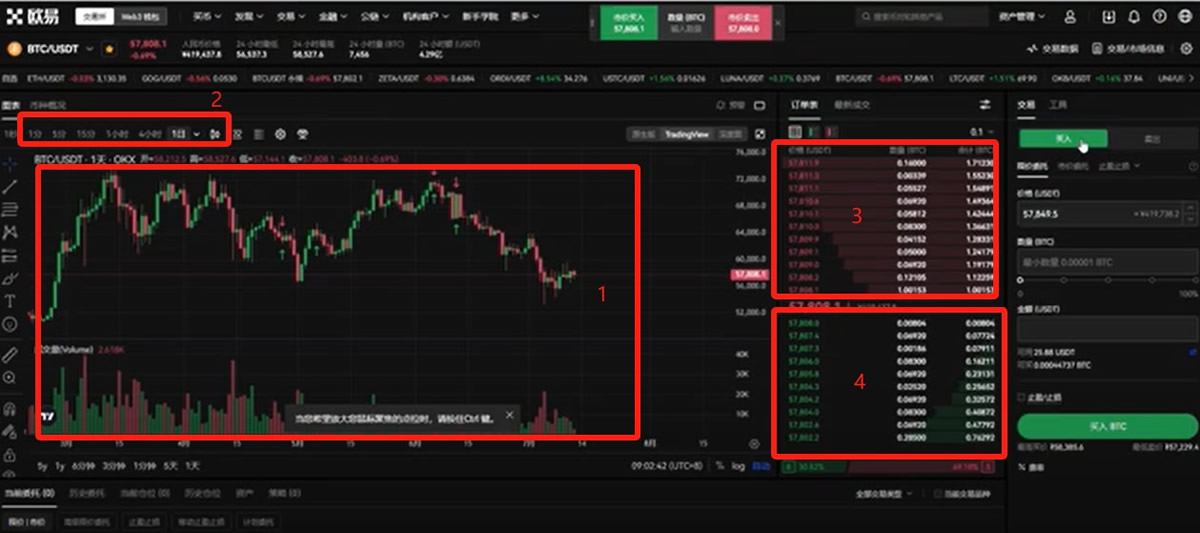 来到交易页面,这里看得很复杂,其实很简单。左边的窗口就是图表,你可以点击这里的时间来切换图表的大小。右边这里是一个订单列表,上方是他们挂的卖单,下方绿色的是挂的买单。这些成交的数量,成交的金额,以及成交的速度这里都有。