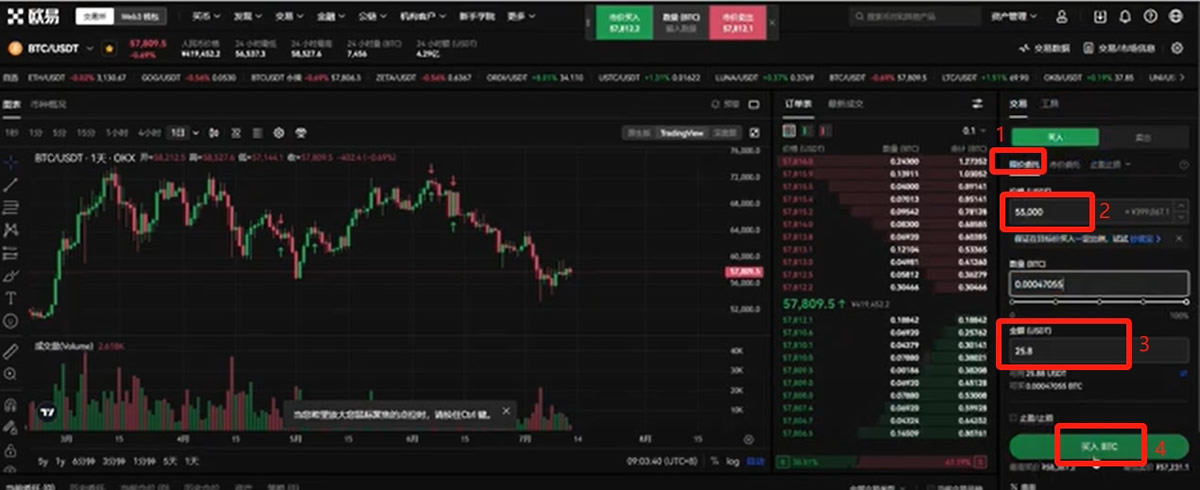 “现价委托”我们可以在这里输入一个价格,比如说现在市场价是57810多,我们觉得现在还略高,还会跌。我们可以输入一个自己想要的价格,比如说55000,输入之后我们在下方拖动数量或者直接在下方输入USDT的数量,点击【买入BTC】。就可以进行一个挂单。