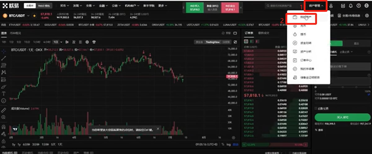 在我们买完USDT之后,我们可以点击左上角的欧易返回到主页,点击右上角的【资产管理】,选择【我的资产】。