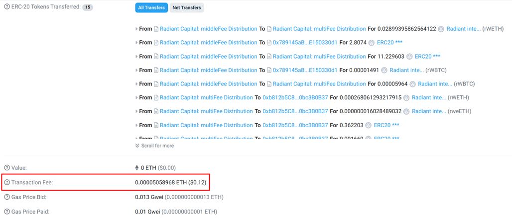加密货币钱包会在您签名前显示交易气体成本。不过,您也可以在区块链上找到这些信息。在下面示例中,我们可以在区块链浏览器中查看交易,例如ArbiScan(Arbitrum 网络),如下图所示,或者Etherscan(以太坊网络交易)。