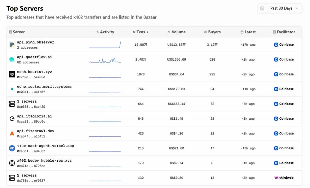 过去 30 天的数据显示,$PING 的接口收到了超过 15 万笔 x402 交易,金额达到约 14 万美元,断崖式领先排名第二的 Questflow