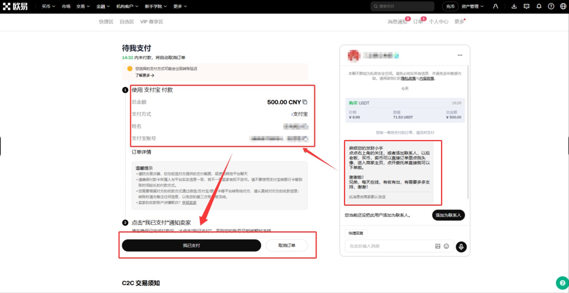 它这里也说支付宝也拒绝红包的,否则他是不放款的。并且你支付宝的实名也要与你平台上的实名是一致的。在我们通过支付宝给他的账号转账对应的下单金额之后,就可以点击左下角的【我已支付】。欧易就会告诉这个人对方已经支付了,你可以去查看,查看完没有问题你就去放币。对方账户的订单界面这里也有一个“我已收到钱,可放币”的选项。转完账后我们静等两分钟,等他给我们放币就可以了。