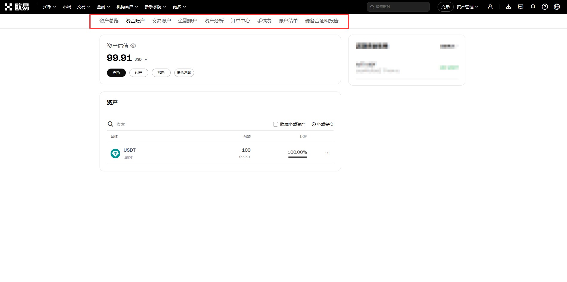 点击进去之后你会发现他上方的菜单栏有很多账户。资金账户、交易账户、金融账户、资产分析、订单中心等等很多账户。我们一开始买到的USDT都是在资金账户里面的。